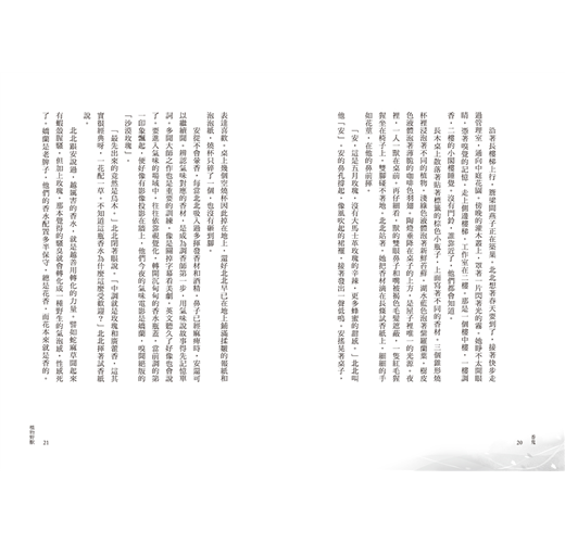 讀這本小說的過程很愉快,因為一路流竄的香氣時時惹人停留。古乃方自然是寫氣味的能手,更極具野心的夾帶高濃度的調香知識。我不免想,或許《香鬼》最好的讀法,是耐性去品味每一處精彩的氣味描寫:「花莖攀折。奇香四溢。綠草擰汁。」「煙燻果香也使他開胃,餓的感覺就是活著。」「時間讓香氣走得更深沉,底是圓潤的,卻又清爽,像是穿上蠶絲。」令人想起朱天文經典之作《世紀末的華麗》裡的女巫米亞:「她將以嗅覺和顏色的記憶存活,從這裡並予之重建。」時空流轉,如今新世紀的色與香,被古乃方寫了出來。