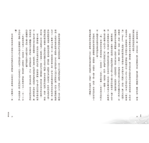 同時身為調香師的年輕創作者古乃方,則揉合奇幻與現實,寫出現代調香師所看見、聞見、想見的氣味世界。直覺犀敏,浮想聯翩,語言輕靈。八篇可各自獨立、又能接續連綴的短篇故事,串成仿如一條瑩亮珍珠項鍊的長篇小說。