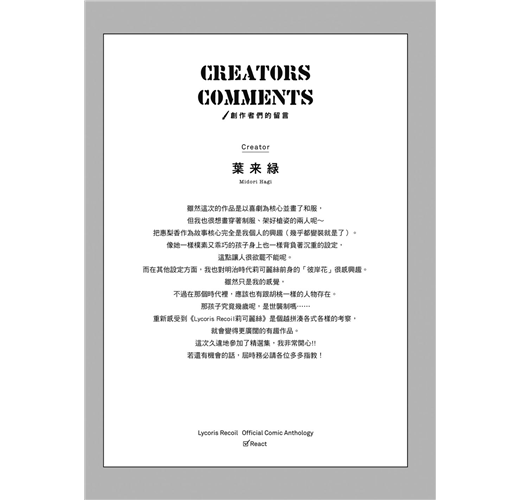 由實力派執筆陣容呈獻動畫《Lycoris Recoil莉可麗絲》的官方漫畫精選集終於誕生!以高密度描寫故事插曲,是《莉可麗絲》粉絲必讀的珠玉短篇集。本書特色★超人氣原創電視動畫《Lycoris Recoil 莉可麗絲》漫畫精選集在此登場!★大家熟悉的莉可麗絲成員錦木千束與井之上瀧奈又回來了♪★首刷限定精美典藏書卡!(首刷售完即無贈品)
