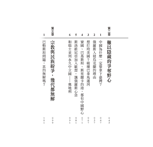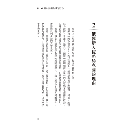 本書從東方的思維,客觀看待東亞的現況以及全球的變局。書中更提到中國一定要拿下臺灣的原因、俄羅斯入侵烏克蘭的理由,及其背後難以隱藏的爭奪野心。另外,宗教與民族紛爭,幾代都無解的課題,如巴勒斯坦、以色列、去維吾爾化、阿富汗、羅興亞人等,這些國際難題應該會延續到下個世紀。