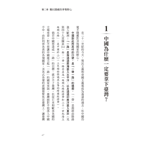 中國為什麼一定要拿下臺灣?書中提到中國高呼「一帶一路」的口號與行動,希冀能對外發展經貿的重要戰略「絲綢之路經濟帶」及「二十一世紀海上絲綢之路」。倘若中國想達成「一路」的目標,就少不了臺灣。