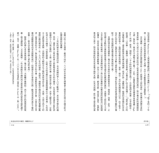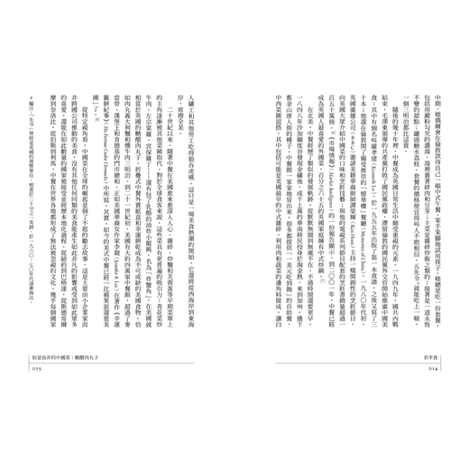 我兒時的那些糖醋肉丸子,無疑應該歸屬於中餐。它們講述的故事,是中國移民想盡辦法適應西方的新生活,創造出一種簡單而經濟的烹飪,既能養活自己和家人,又能迎合心存疑慮的西方人的胃口。這個故事裡也有經濟焦慮、地緣政治大事件與種族偏見的陣陣餘波,這些元素的合謀,讓西方人一葉障目,無法欣賞到真正的中餐。糖醋肉丸子同時還是一個鮮明辛辣的諷刺:一個多世紀以來,西方人對佐以酸甜鹹醬料的廉價油炸中餐表現出無與倫比的偏愛,轉頭又將自己「不健康」的飲食習慣歸咎於中國人。