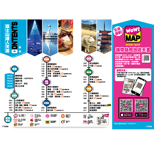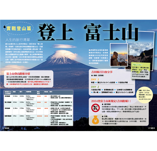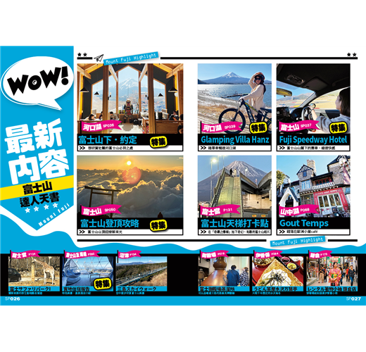 - 富士山下.約定:內裡介紹多個可以和富士山打卡的玩樂場所、餐廳、賽車場、glamping、酒店等,還有攀登富士山的過程全紀錄,是前往富士山潮聖的遊人出發前必看的特集!