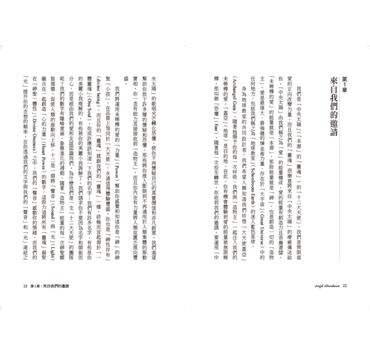 為了幫助讀者體驗到振動的正向轉換並感受到那股能量,我們刻意地將某些字的字首以大寫呈現,例如「天使」(Angel)、「真理」(Truth)、「心」(Heart)、「靈魂」(Soul,譯注:中文譯稿以「」代替字首大寫的英文字)。當你的眼睛注意到該字開頭的大寫字母(譯注:中文則為「」),你的陰性直覺腦就知道要將頻率從人世間的頻率提升到「天堂」的頻率。我舉個例子告訴你這點如何運作。看見angel與Angel,或divine oneness與Divine Oneness這兩個英文字詞的時候,你是否感覺到振動的差異呢?基於類似的原因,「天使」們為你提供詞彙表,幫助你感受豐富的《大天使豐盛法則》教導中的「真理」。請隨意漫步到那座詞彙花園,好好體驗種植在那裡的療癒之愛。要永遠帶著你的神聖內在小孩(divine inner child),因為這個「小孩」(Child)是打開「造物主」(Creator)最大財富金庫的鑰匙。我的「小貝琳達」每天都向我證明這點。