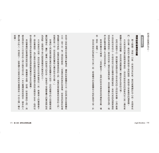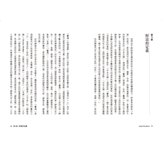 在大天使眼中,財富指的是你接通「本源」的能力,那能使你得到安全、健康、自由、快樂所需要的一切。真實而持久的財富來自於「中央太陽」,透過你的「靈魂」到達你。你的「靈魂」有取之不竭的財富,化為有創意的才智傾注到你的生活體驗中。