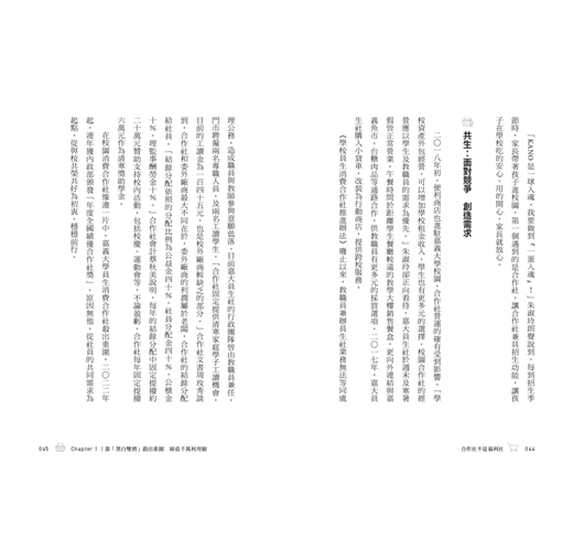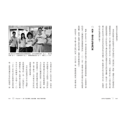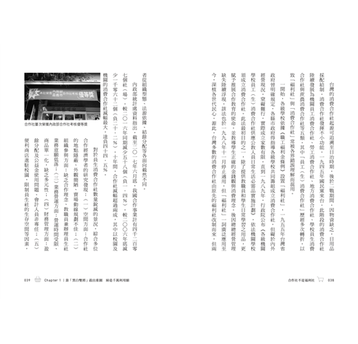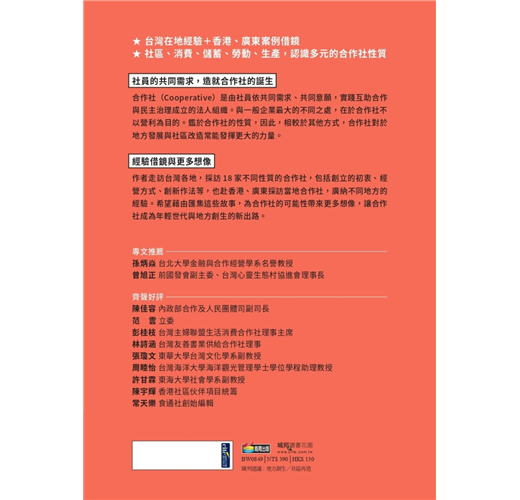▎合作事業是社會基層的組織,道德經說「千里之行、始於足下」,從健全基層組織著手,一步一腳印,為社會普羅大眾改善生活,提高生產力,緩和資本主義的貧富不均與階級對立,才是實現祥和社會的基礎工作,從這個觀點說,本書的出版是別具意義的。