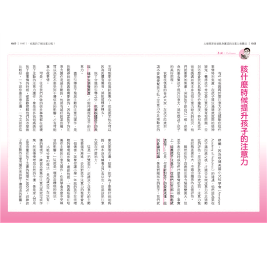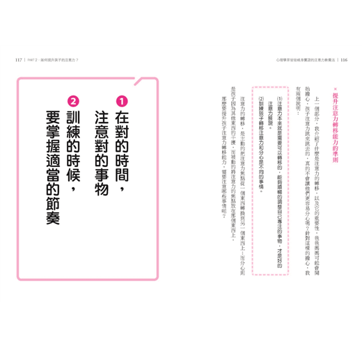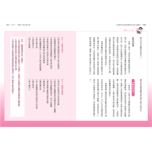 這本書和一般注意力書籍或者育兒書籍有一個明顯的不同,就是理論與實踐並重。我知道很多的注意力育兒書籍,基本上是各種遊戲的操作手冊,試圖透過紙上活動的方式,來提升孩子的注意力。這樣的做法沒有不好,但是效率不佳,而且不能夠對症下藥。揚名介紹理論的方式,跟教科書是完全不同的,非常容易理解,我就知道很多爸爸媽媽在讀這本書的時候,都是一氣呵成讀完的,我想這就是最好的證明。