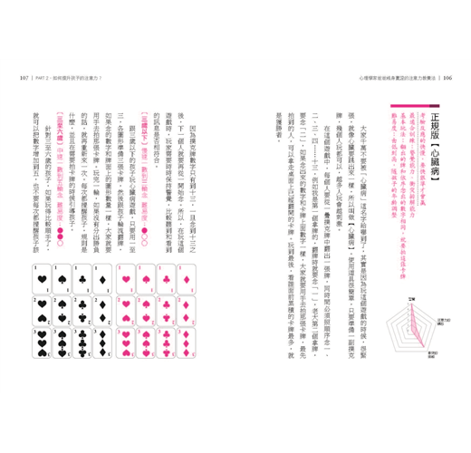 書裡面所介紹各款遊戲,依難易程度分有初級版、進階版、變形版、挑戰版等不同玩法,穿插有情境漫畫及遊戲圖解,並以雷達圖標示該款遊戲可幫助提升能力(注意力、警覺力、創造力、記憶力、語言或數理能力等),寓教於樂,方便家長跟家中大小孩、小小孩因時因地做各種不同的變化。