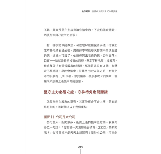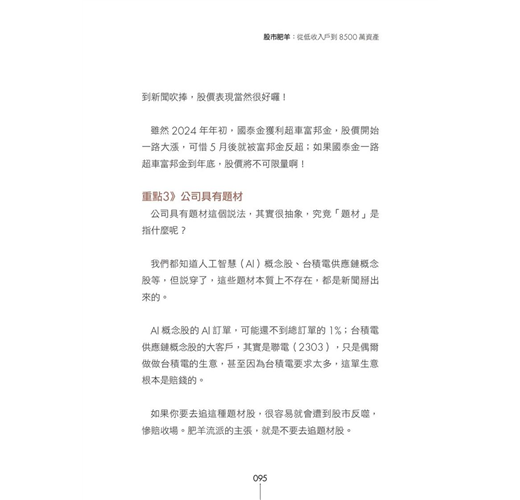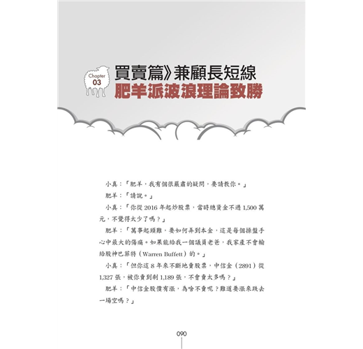 相信買股要迅速,賣股要謹慎,平時要多睡覺。認為投資者不應聽信他人建言,只需紀律地照著公式操作。他利用自創的肥羊派波浪理論,在大盤下跌時不斷進場拉低平均成本。近幾年更是在大盤低檔時積極運用槓桿操作,至今總資產(含房產)已達8,890.3萬元,並且公開股票存摺供所有人檢視。