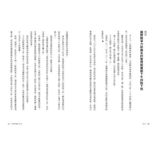 推薦序 聰明、自律的幸福工作法則 吳媛媛 我在瑞典的大學工作,常覺得瑞典同事們,尤其是家裡有孩子的,每天來去就像一陣風。下午四點還沒到,各個辦公室就傳來窸窸窣窣準備回家的聲音,四點過後,辦公室樓道鳥獸散盡,還留下工作的,往往是中國和日本同事。與歐洲國家相比,東亞國家的法定休假天數一般較少,最高工時也更長。除了法制之外,台灣人即便離開公司,仍習慣把工作帶回家做,或是在半夜、假日回覆工作郵件和訊息。過勞文化下,忙到沒時間生活,已經是台灣上班族的普遍寫照。 看看光譜另一端,社會福利著稱的北歐國家,不管...