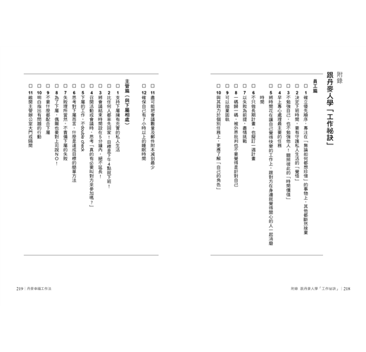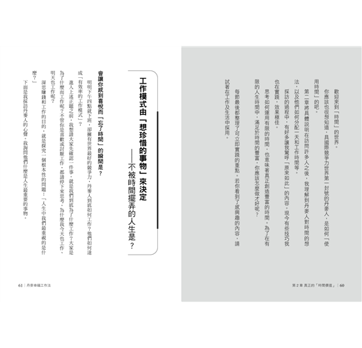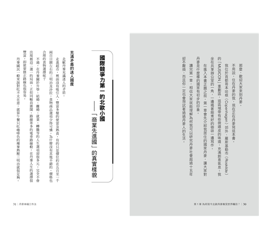 【摘錄1】_第1章 為何現今北歐丹麥備受世界矚目? 國際競爭力第一的北歐小國──「商業先進國」的真實樣貌 ◎充滿矛盾的迷人國度 北歐丹麥充滿迷人的矛盾。走進超市,裡面沒有吸引人、豐富多樣的便當及熟食,有的只是價位約在五百至一千兩百日圓左右的三明治及沙拉,食物商品選項少得可憐。為什麼這裡沒有其他不錯的、價格也合理的食物選擇呢? 不過,在丹麥關於升學、結婚、離婚、就業、轉職等的人生選項卻很多元,完全不會出現被迫二選一的局面。正如同幅員廣闊、路線眾多的電車路線般,在丹麥人生的選擇很豐富,即使要修正路線也很容易。 丹麥國民一般來說對吃不太在意,就算午餐只吃咖啡色的裸麥熱壓三明治就很足夠。相對於此,卻有很多男性享受烹飪樂趣,且在丹麥引領世界美食潮流的餐廳也意外地不少,雖然價位高得驚人。 丹麥物價高昂,在咖啡店點一杯拿鐵,加一個三明治就要約兩千五百日圓,而兩 千五百日圓也是這邊一般的最低時薪。稅金也高,消費稅高達二五%,薪水的一半都必須拿來繳稅。不過醫療及教育完全免費,社會福利制度良好,給人一種不管人生發生什麼事都沒問題的安心感。 丹麥國民喜歡打造家庭菜園,週末就去公園或森林散步,熱愛悠閒的自然生活。丹麥也是「數位先進國」,連高齡長者也會使用網路銀行服務或在線上辦理手續。 丹麥面積比台灣大,4人口數約五百九十萬,但在各類國際社會評比排行上,如幸福度、低貧困率、貧富差距小、低貪汙率、數位化、國際競爭力卻是壓倒性的勝出。5 我實際住在這裡後發現,類似這種矛盾並非矛盾,而是必然。乍看之下會以為這是一種矛盾現象,但其實蘊含因果關係。或許大家現在還無法理解原因,但讀完本書之後,相信你們都會深深同意丹麥的優秀其來有自。 【摘錄2】_第1章 為何現今北歐丹麥備受世界矚目? 「工作與生活平衡的先進國」──晴朗的平日,午後就躺在草地上 ◎實現「工作與生活平衡」的世界第一城市──哥本哈根 根據富比士(Forbes)調查指出,在二○二三年世界主要城市評比中,哥本哈根獲選為實現「工作與生活平衡」的第一名城市。關於哥本哈根奪冠的理由,富比士做出以下分析。 生活在哥本哈根的人們非常重視「Hygge」(舒適),重視自己也尊重他人,時間用在放鬆及享受人生的快樂。此外,職場上也尊重每個人的私人生活,每年都有長達五週的假期,並提供彈性上班制,以及夫妻合併共五十二週的育兒假。 生活在這裡之後,我完全認同這番言論。尊重自己也尊重他人的私人生活,這就是丹麥。「人生最重要的,並不是工作啊。」這就是在丹麥生活的前提。 即便如此,丹麥卻是國際競爭力世界第一,真是不可思議。 看來似乎不需要靠犧牲私人的「生活」,也能產出「工作」的成果。 反之,正因為丹麥人重視「生活」,才能在休息時好好充電,之後再把能量投注在「工作」上。 不對,不只是這樣。進一步來說,丹麥人「工作」的目的,是為了充實「生活」,因此不剝奪私人時間,而是在最短時間內達成最大效果。 若你跟過去的我一樣,總是犧牲私人生活,而覺得「我明明這麼努力,為什麼會這樣……」的話,或許在面對人生及工作態度上,有根本性的錯誤。 因為我們是為了「生活」所以「工作」,若為了「工作」而犧牲「生活」,就是本末倒置了。隨著人生電量用盡,就連「工作」也無法好好做。 「工作」終究只是充實「生活」的手段而已,兩者不該是互為取捨的關係。「工作」和「生活」必須是相互積極的互補關係。 只要能充分享受「生活」,就能為自己充飽電,然後投入「工作」。「工作」的目的到頭來是為了充實「生活」,因此能用最短時間達到最大工作效果。而且,為了「工作」與「生活」更為充實,正是將「工作」所得到的資源(金錢、知識、技能、人脈、休假等)投入工作與生活,才能產生愉快的良好循環。 這個正向循環,不就是真正意義上的「工作與生活平衡」嗎? ◎會讓你感到喜悅而「忘了時間」的瞬間是? 明明下午四點就下班,卻擁有世界最好的競爭力,丹麥人到底如何工作?他們如何達成「有效率的工作模式」? 進入上述正題之前,我想請大家先確認,我們到底為了什麼工作?不管你喜歡或討厭工作,都請停下來思考。為什麼我今天也工作、明天也工作呢? 深思賺錢和工作的目的,就是探究一個根本性的問題:「人生中我們最重視的是什麼?」 下面是我採訪丹麥人的心聲。我詢問他們什麼是人生最重要的事物。 「人生最重要的就是享受,還有認識新的人,所以我會一個人去旅行。還有,我希望身體健康,希望有一定的經濟自由。重要的不是錢本身,而是擁有金錢之後,我感受到的自由。」(文森〔Vincentz Costas〕,男性) 「這個啊,我很後悔之前一直忙於工作。以前的我為了升職,有好長一段時間每天都忙到很晚。但現在,我不想再那樣工作了。我的孩子都已經長大了,到了要決定人生方向的重要時期。在孩子離家之前,我希望盡可能多跟他們相處,多跟他們聊天。」(凱特琳娜〔Katrine Aadal Andersen〕,女性) 「我希望在離開人世前,可以對自己的人生感到滿足。我不需要變有錢,也不需要成為偉大的人,我只希望感到滿足,朋友跟孩子就是我的喜悅。我希望孩子健康快樂,遇到好伴侶,我想他們過得開心。」(延斯〔Jens Matthias Baecher〕,男性) 「人生中重要的事就是要健健