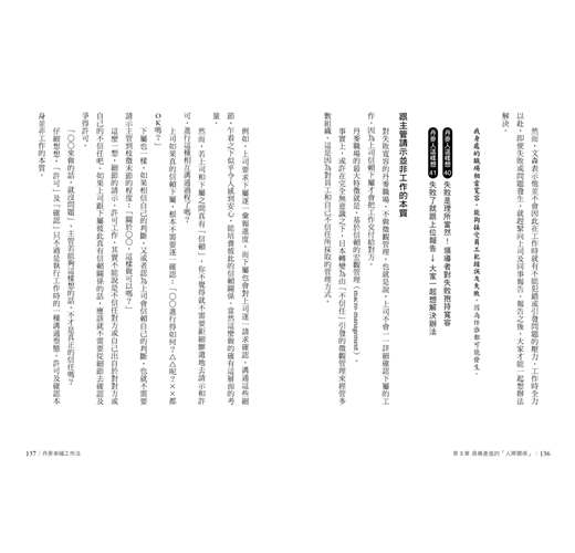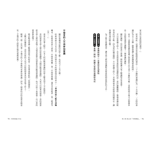 推薦序 聰明自律的幸福工作法則 吳媛媛 推薦序 丹麥人的專注,造就了幸福平等的社會 張宇文 前言 國際競爭力前幾名的管理階層都下午四點下班 一窺丹麥人的思考方法 為了發揮最好的表現,丹麥人會怎麼做? 改革日本人的生活方式,可能實現嗎!? 第1章 為何現今北歐丹麥備受世界矚目? 國際競爭力第一的北歐小國──「商業先進國」的真實樣貌 充滿矛盾的迷人國度 「世界最幸福國家」只是丹麥的一個側面 世界第一的壓倒性「企業效能」 競爭力的關鍵是面對時代變化的能力 引領時代的「先見之明」──享受變化,同時有令人驚豔的對應力 「世界第一的自行車城市」哥本哈根 從「無現金社會」到「無卡社會」 大膽捨棄舊體制 〔我眼中的丹麥〕 新冠肺炎政策先進國──率先解封的國家 「工作與生活平衡的先進國」──晴朗的平日,午後就躺在草地上 不喜歡工作的「幸福國度」 實現「工作與生活平衡」的世界第一城市──哥本哈根 積極參與並在家長會上踴躍發言的父親 無論工作或家事育兒都是「夫妻共同參與的專案」 在日本及丹麥共同投資的公司工作後,發現的事 從「家人一起吃晚餐」開始 工作方式因人生優先順序而不同 看懂「潛在需求」的能力 第2章 真正的「時間價值」──為了充分享受人生而「在限制內擠出時間」 工作方式由「想珍惜的事物」來決定──不被時間擺弄的人生是? 會讓你感到喜悅而「忘了時間」的瞬間是? 「幾乎沒有跟朋友碰面的時間」 拿回時間! 不勉強自己,也不勉強別人──尊重彼此的「時間價值」 為了獲得「愉悅的瞬間」 自己不「應酬」,也不勉強別人「應酬」 週五下午兩點下班 生產力源自於「對工作的喜悅」 會議設定議程及結束時間 中間管理職負責開會 一小時的會議設定為五十分鐘 不發言的人不用參加會議 跳過中間管理職的「確認」 不需要雙重核對 盡量少寄電子郵件副本 制定郵件處理方式的規則──確保集中回覆的時間 不勉強自己,也不勉強別人──尊重對方的時間 〔我眼中的丹麥〕 優秀的「工作生活平衡世代」 死守私人生活的工作方式──追蹤丹麥人的一天 守護私人生活的「覺悟」 「下午○點之前就下班!」 三十分鐘吃完午餐!工作時間集中精神 活用彈性制度──依照自身狀況調整工時 彈性運用居家上班 規畫夫妻的工作分擔 下午四點前未完成的工作,晚上再做 為「追上工作進度」,在自由時間工作 「希望妻子也能感受工作的喜悅」──夫妻之間的工作平衡 放鬆很好!因為放鬆,所以很好!──創造休閒非正式→創造力→生產力的良好循環 非正式帶來生產力的理由 不必正襟危坐──形式、手續、規則都不需要 站著工作 「休假」才能維持熱情 睡前看電視放鬆 週休三日的效用──留白才能創造靈感 在日常生活中健行 「休長假理所當然」的氣氛──三週暑假 〔我眼中的丹麥〕 翻譯家霍美德的「人生平衡」 第3章 具備產值的「人際關係」──在信賴的基礎上,依賴與被依賴 「失敗也沒關係」,所以能夠挑戰──基於信賴的「宏觀管理」 一邊造橋,一邊渡橋 不執著於「已決定好」的計畫 「有意識地」重新擬訂計畫 「我們誰都會失敗」 跟主管請示並非工作的本質 宏觀管理創造「時間價值」──上司與下屬都更輕鬆 綠燈前行! 丹麥上司真的不會生氣嗎? 〔我眼中的丹麥〕 教育現場也講宏觀管理!? 沒有上下關係的平等職場──上司是下屬的導師 隨時都能商量 讓下屬察覺自己在公司所「負責的工作」 只要達成目的的手段都行──不問方法 若工作無目的或意義,就要面對下屬的質問 樂高公司高層與清潔人員平等對話的理由 為了下屬說NO的勇氣 〔我眼中的丹麥〕 丹麥人不忍耐的能力 「不勉強自己也不勉強別人」的溝通──自然產生「最強團隊」 若能成功培養人際關係,也就等於完成工作 看透下屬的興趣及專長,以此組成團隊 為了統整多元個性的「必要品項」 丹麥職場要求的「社會性」是什麼?──四個重點 「適才適所」×「社會性」,成果最強! 最佳成果來自「好能量的循環」 第4章 培育國際競爭力的社會「架構」──以轉職為前提的資歷養成 丹麥人的「工作觀」──思考「想做的事」與「意義」 你腦袋裡想的都是「工作」嗎? 私人生活第一優先 工作不是賺錢的手段!? 工作是為了「自我成長」──將工作視為教育機會 工作是「身分認同」──見面時,你會先被問從事什麼職業 工作追求的是「意義」──「社會意義」與「對自己的意義」 正向看待轉職的社會 沒有明確的職涯規畫 為了讓自己能對社會有所貢獻 企圖心與意志創造出「高度生產力」 〔我眼中的丹麥〕 請教尼可拉斯‧布倫伯格世界第一的「生產力祕訣」 丹麥追求「適才適所的配對」──將社會資源活用到極限 後記 謝辭 附錄 跟丹麥人學「工作祕訣」 註解