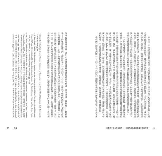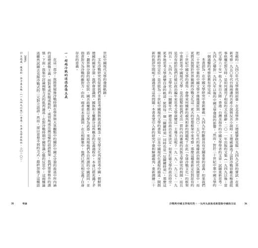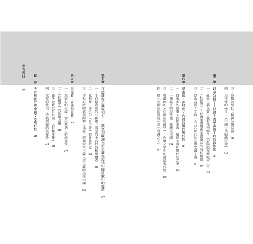《冷戰與中國文學現代性》處理二十世紀中期中國政治的劇烈變動及其文學表徵。一九四九前後國共內戰導致台海對峙,影響至今不息。針對這一課題兩岸文學史從來高調處理,建國與淪陷,集權與民主,共產主義與資本主義,革命與離散,甚至邪惡與善良等二元辯證都是耳熟能詳的論述。這類論述雖然有其道理,但不足以說明歷史情況的詭譎以及文學曲折的回應方式,也忽略了國共內戰與世界局勢的聯動影響,等而下之者則成為口號宣傳的附庸。