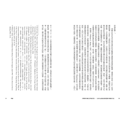 自從本書的英文版問世以來,文化冷戰研究已蔚然成風,成為北美學界重要的學術領域。隨著更多的檔案開放,學術著作精采紛呈,在英文世界如雨後春筍一般出現。筆者一方面為文化冷戰研究取得的深度廣度高興,同時也覺得無法加以引用和對話,深以為憾。此處略提自本書英文版寫作出版後,文化冷戰研究領域出現的幾個新的重要研究方向,以及其中主要論著,作為補充。因篇幅原因,不能一一點到,只能有待將來專文補足。