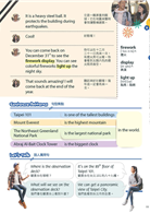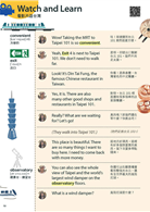 本書分為台灣北部、中部、南部及東部&離島四大部分。各課扉頁先介紹該景點的概況與特色。接著是精美的大圖解,讓讀者能藉由視覺學習的方式來認識單字。然後進入「看影片遊台灣」單元,藉由LiveABC 團隊走遍各地的影片拍攝與介紹,讓讀者也彷彿置身其中在當地遊覽。這個單元亦彙整出「句型焦點」和「旅人實用句」,讓讀者能在自身旅遊或介紹景點時靈活應用。各課程還精心規劃了「知識小站」,比如彙整台灣各地的國家公園與特色、介紹各種海蝕地形、圖解製糖過程、簡介布袋戲角色的分類等,讓人瞬間擴展多樣化的知識領域。書中並不時加入「延伸閱讀」或「旅人加油站」單元,讓讀者能更深入了解當地或迅速掌握值得造訪的景點。