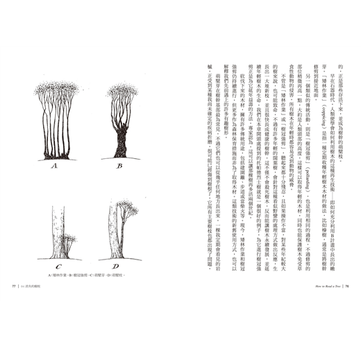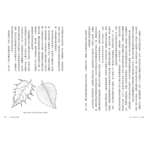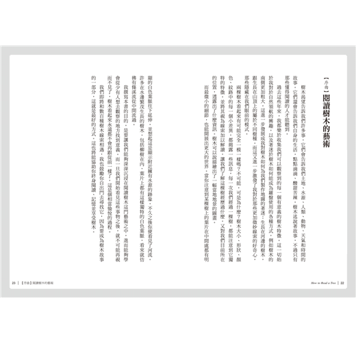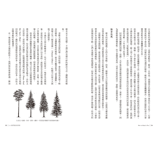 .搭配圖片解說:32張實景彩色照片,35張呈現意境或描繪細部的手繪插圖,幫助讀者直觀地理解樹木的各種特徵和變化。