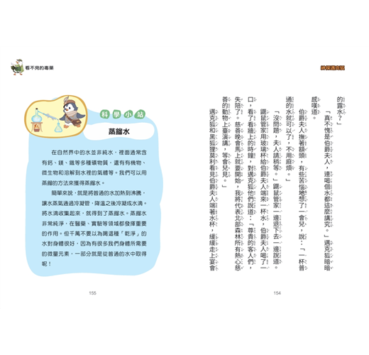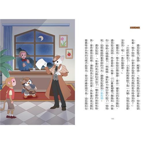 ✦科學小站:每個案件背後都隱藏著科學原理和科普知識,包含物理、化學、生物等六大學科知識。本書的科普小知識:作用力與反作用力、眼鏡蛇、大氣壓力的力量、大氣壓力、發臭的花瓶、染色鮮花、夜光的原理、鐳、蒸餾水、海芋。