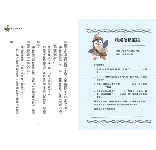 ✦「偵探謎題」與「偵探密碼本」:邀請小偵探們一起來挑戰終極密碼,答案就藏在本書的神祕數字裡,找到數字後,利用書末的偵探密碼本,就可以解出謎題。