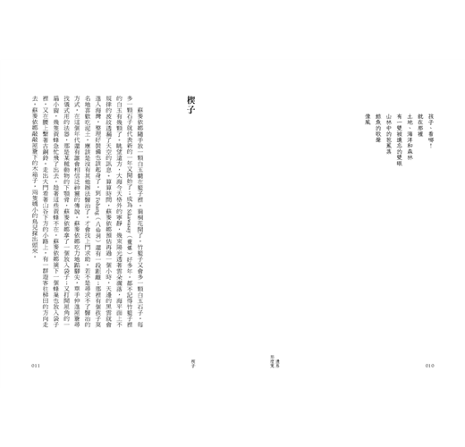 海洋反射著輕柔的晨光,沙灘上橫放著漂流木,是為了方便將滿載漁獲的舢板拉上岸所預備。小徑兩旁的雜草露水尚未蒸發,一段路走來褲管早讓露水沾濕。蘇麥依娜走在樹林裡,看見凌子那孩子帶著弟弟古拉斯,尾隨著自己的母親刻意保持一段很長的距離。海面那一方,晨曦將海面染成了紫色薄霧,海灣上行走的人像小螞蟻在海灘移動,法妞(貓的名字)總會安靜地陪伴著姊弟倆。
