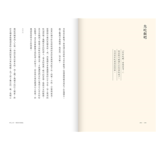 但就在這些過程中,一日三餐變得奢侈,開心放鬆吃飯,也在必須將目光展望於自我期許的待辦事項下,逐漸變成可有可無的選項。看著社群上那些拍得有如珠寶般珍貴的菜餚、奢華的料理對決,扒著手中由陌生人送來,勉強算得上圖文相符的外食,真是說不上來的落寞。