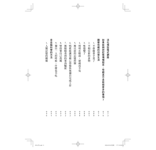 直到母親的症狀變得無法忽視,她決定運用自己的專業知識,正面迎擊這個被稱為「高齡社會世紀之癌」的絕症,更重要的是,探索心中那股強烈的不安:當家人失智時,我們到底在恐懼什麼?而當記憶逐漸消失了,母愛還在嗎?