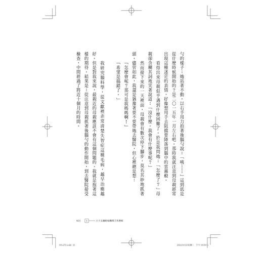 我就這樣每天觀察母親的變化,然後從腦科學的機制去瞭解任何變化所代表的意義;在兩年半的時間裡,我如同寫日記地記錄、思考母親的轉變。