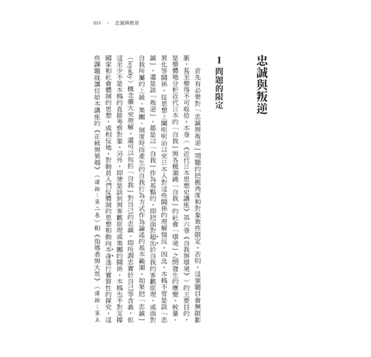 在中文世界裡,已有中文譯本的丸山眞男著作除了前述提到的以外,還有《日本政治思想史研究》(徐白、包滄瀾譯,台北:台灣商務印書館,一九八○年;王中江譯,北京:生活.讀書.新知三聯書店,二○○○、二○二二年)、《現代政治的思想與行動》(林明德譯,台北:聯經出版公司,一九八四年;陳力衛譯,北京:商務印書館,二○一八年)、《丸山眞男講義錄(第六冊)》(唐永亮譯,成都:四川教育出版社,二○一七年)、《日本的思想》(藍弘岳譯,新北市:遠足文化,二○一九年;唐利國譯,北京:生活.讀書.新知三聯書店,二○二二年)、《忠誠與反叛:日本轉型期的精神史狀況》(路平譯,上海:上海文藝出版社,二○二一年)。在此,我想先談談這些著作在丸山思想史學脈絡中的相互關係和《忠誠與叛逆》的定位。