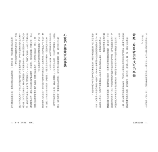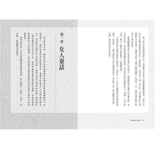 以榮格心理學觀點解讀《小紅帽》、《睡美人》、《傑克魔豆》、《紅鞋》、《藍鬍子》等8則經典童話,分析「女人」、「男人」、「壞人」、「愚人」四大主題