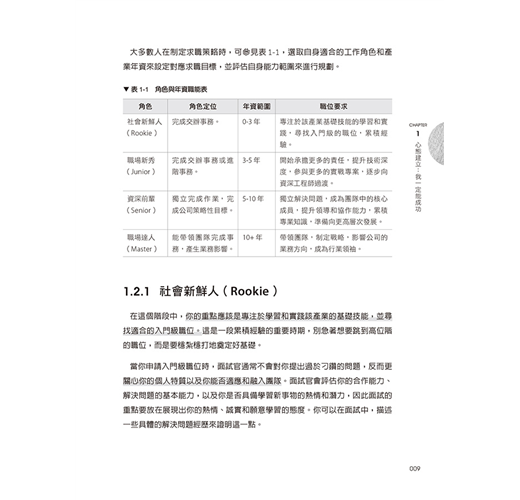 隨著年齡的增長,我也成為了面試官的角色,經過10年以上的職場歷練,查閱至少500+的面試者履歷,到超過至少100場以上的實際面試官經驗,可以說深刻理解求職者的痛點和需求,希望透過本書分享我的職涯經驗,也能幫助你實現屬於你自己的成功職涯。
