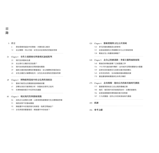 全書以6個篇章探究畫家陳進生命經驗,觀察其創作歷程的軌跡變遷,試著解析其不同階段作品再現的價值與意涵,包含戰前陳進在日本殖民統治時期的藝術創作、統治結束時期,再到戰後正統國畫之爭對藝術家創作心靈的衝擊,以及步入家庭後生命的變化。書中亦聚焦博物館、美術館的女性主義藝術行動策展,探討以機構展覽重新詮釋藝術家與作品,進而促成社會變革、成就公共價值。