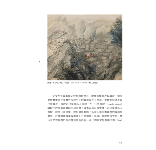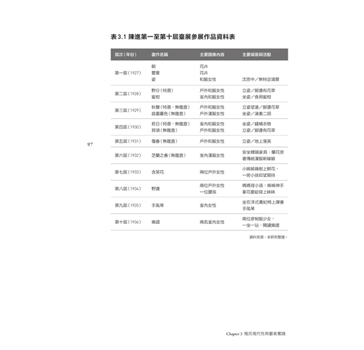 然而,前述這些論述角度無疑是將女性創作者框限於家庭私人領域,無視於進入現代化的歷史階段,女性積極走向公共領域、以期參與社會公眾生活的歷史樣態。這構成了本書構成的第二項重要動力──從更長遠廣袤的藝術史視角來考察,女性藝術家的作品是否已經面臨著被窄化、限縮與刻板印象的危機,如此一來,不僅無法真切地貼近個別女性創作者的心靈,僅以固定的觀看視角來理解與想像,更反過來以此論證女性藝術家人數稀少,女性藝術創作表現有限云云之套套邏輯。因此,本書是否可以陳進的藝術創作生命歷程,來挑戰前述的刻板印象與陳舊框架,而在藝術史的論述中,找到新的觀點與詮釋?