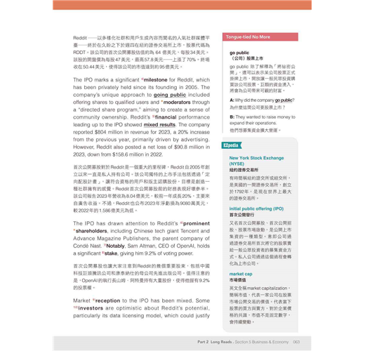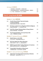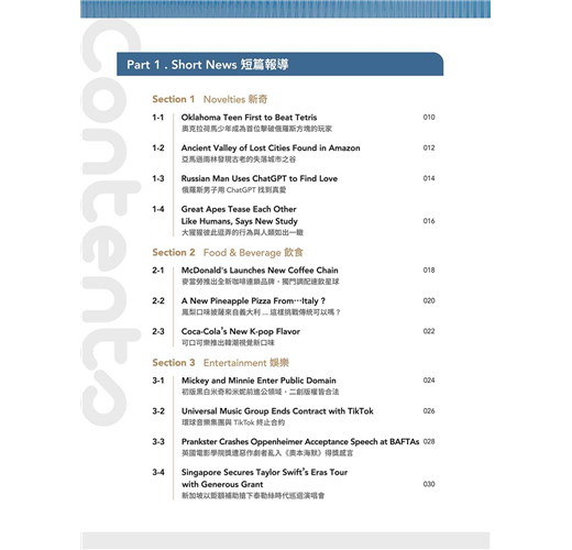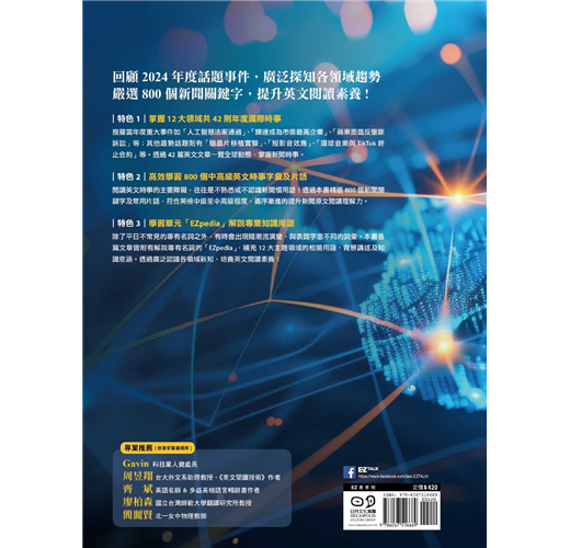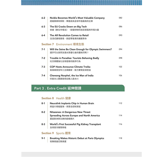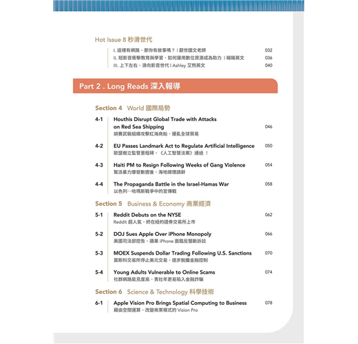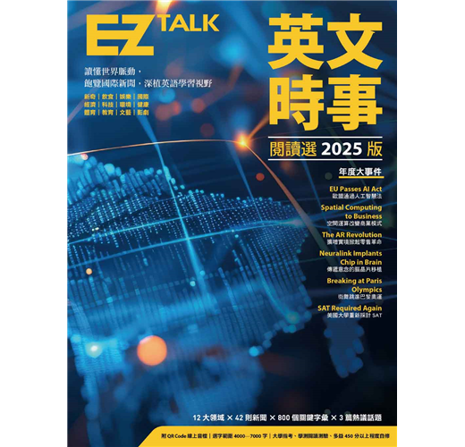 搜羅當年度重大事件如「人工智慧法案通過」、「輝達成為市值最高企業」、「蘋果面臨反壟斷訴訟」等;其他趨勢話題則有「腦晶片移植實驗」、「短影音效應」、「環球音樂與TikTok終止合約」等。透過42篇英文文章一覽全球動態,掌握新聞時事。