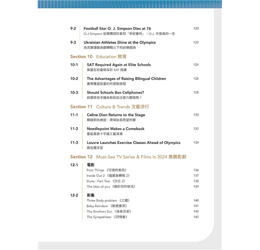除了科技相關新聞事件,本書也將回顧諸如社群網路引發的金融詐騙、橄欖球巨星:辛普森的一生 、戰火下的烏克蘭運動員 、莫斯科交易所停止美元交易等等,另外影劇推薦也有相當值得深思的《腦筋急轉彎2》、《可憐的東西》、《三體》、《馴鹿寶貝》,希望讀者們能夠透過本書這 42 篇英文時事文章,在學習英文的同時一併拓展閱讀世界的角度,與時俱進!