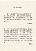 ……幾乎上窮碧落下黃泉的追查它們的前世今生,如他自已說的,那是史詩級的美麗故事,他奮筆寫下本書,用許多時間寫了二十幾萬字,述說屬於溫泉鄉北投這一百多年的歷史與傳說。—謝長廷