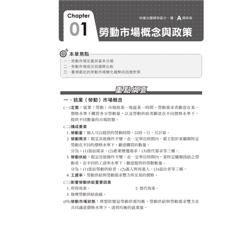 本書針對高考、普考、地方三、四等申論題型考試精心編寫,彙整重要必考觀念,並標示各章主題的頻出度,有助於規劃讀書進度,將時間做有效分配。課文並搭配圖表,將組織或數據統計以直觀的方式呈現,便於記憶,節省大量準備時間,學習吸收事半功倍。