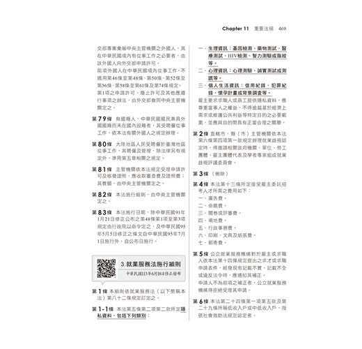 書末完整收錄最新相關法規條文,並有QR code設計供隨時查閱,搭配QR code,即可自動連結至全國法規資料庫,隨時獲取最新資訊,不怕錯失法規更新。即刻掃描、即刻查詢,快速熟習就業安全制度相關之政策及法規。