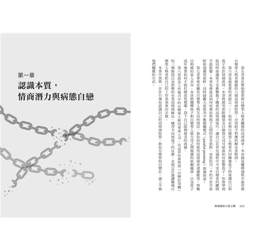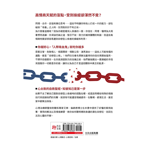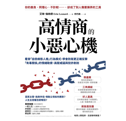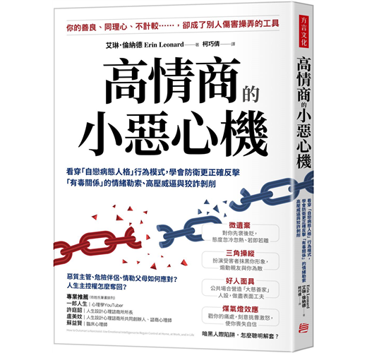 作者艾琳・倫納德深入剖析「自戀人格」的行為模式,教導讀者如何透過高情商的「小惡心機」在職場、感情生活、親子教養等方面保護自己,從逆轉思維到實際的防衛技巧,幫助讀者認清情緒虐待關係,擺脫自戀者的操縱,重拾自信心與平靜的生活。