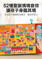 這本聖誕有聲書不僅充滿節日氣氛,還是孩子學習語言的好幫手!書中收錄了 52 種聖誕情境音效,讓孩子通過聆聽鈴鐺、雪地腳步、包裝禮物等真實聲音,認識聖誕節相關的場景與事物。同時,每個情境還搭配中文和英文雙語單字,讓孩子在聽故事的同時,學習兩種語言的基礎詞彙。