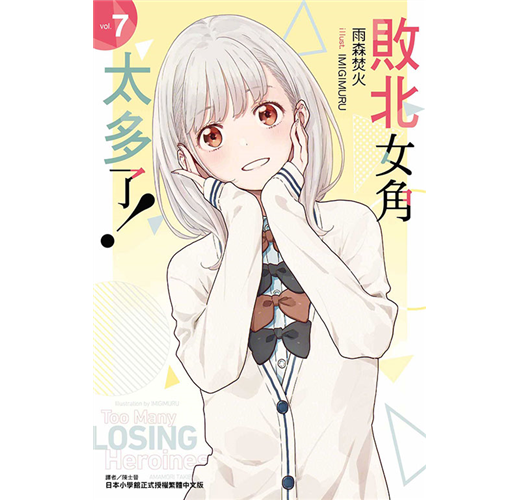 敗北女角太多了!7「……社長給人的感覺好成熟喔。」石蕗高中一年級新生,白玉璃子。在小拔老師的介紹下來到文藝社的心機可愛學妹。沒錯,我們都被這惹人憐愛的外貌完全騙倒了。原本還以為她是拯救我們於廢社危機的天使,沒想到竟是因為惹麻煩而停學中的超級問題兒童……被捲進婚禮會場潛入任務「白玉璃子‧捲土重來大作戰」的文藝社,明日將在何方!?充滿敗北女角的戀愛喜劇,學妹旋風肆虐的第7彈!