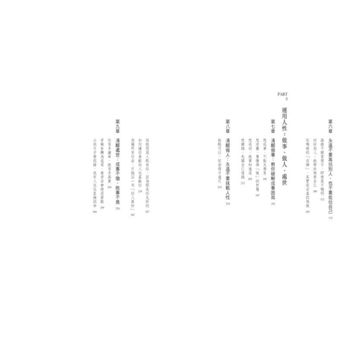 本書分為三個部分。第一部分帶你看見人性,我們看到的很多事情往往只是表象,其背後隱藏的真相才真正值得深思。如果你覺得世界很複雜,無論怎麼努力都過不好這一生,那麼這部分內容可以幫助你活成一個明白人。第二部分帶你學習人性,借助對人性的認知來提升自己的思維深度,轉變固有的不合理思維,洞見背後的本質規律,並將其揉進自己的認知框架中。第三部分帶你運用人性,只有放大人性的優點,規避人性的弱點,才能在這複雜的人世間清醒地做事、做人、處世。