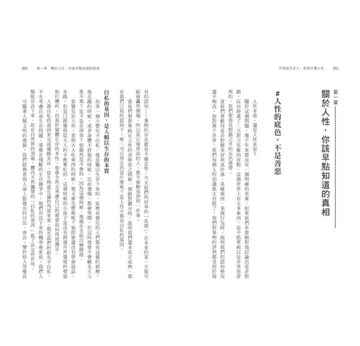 人類是社會動物,我們存在於各式各樣的關係之中,而這些關係運作的底層邏輯,就是人性。本書作者指出,人性的本質無關好壞,都是自私的,甚至所謂的善良、理性這樣的美好特質,其實背後的原因,都是自我利益的最大化。