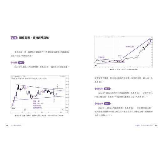 2024/5/7 選出比較大的三角收斂型態(見圖表2-4),之後在5/15突破上緣走漲,經歷過一小段回測又繼續往上走(見圖表2-5)。