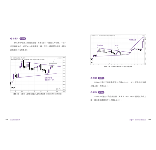 2024/5/29 選出三角收斂型態(見圖表2-8),後面又再收斂了一段,角度越來越小,直至6/13 收盤突破上緣,等待一段時間的整理,就出長紅噴出(見圖表2-9)。