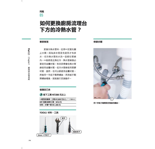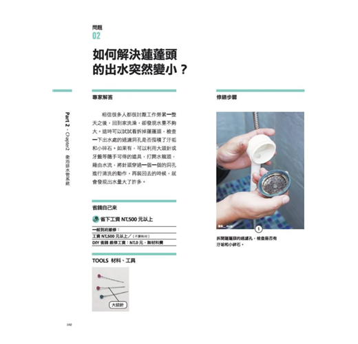 舉例說明:如何防堵衛浴排水孔的小飛蟲或蟑螂?跳電了!該怎麼檢查和維修?漏水了,自己也能更換馬桶水箱的零件!如何幫落地紗門或紗窗更換滑輪?木地板出現疑似蟲咬的小洞孔,怎麼辦?如何確保瓦斯安全?無水源也漏水防水?防水塗料的緊急補救工法!