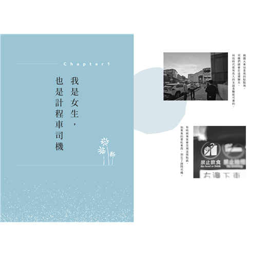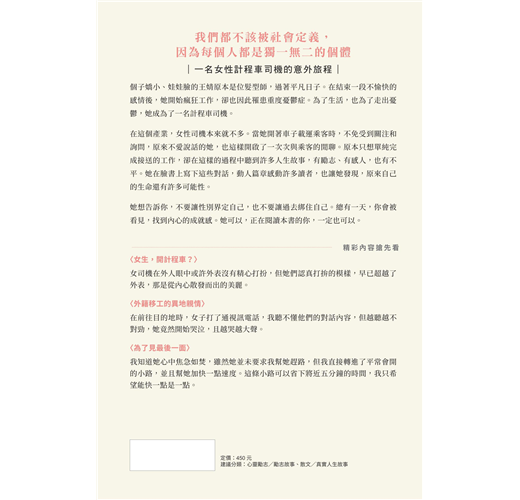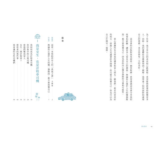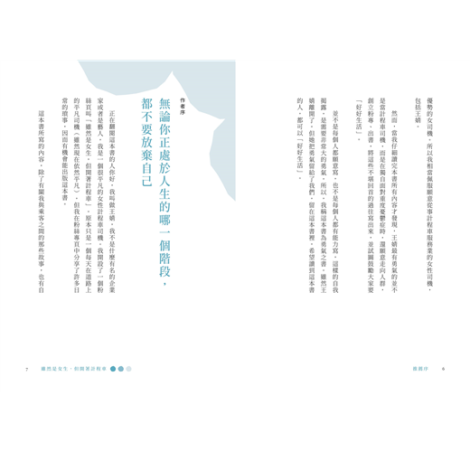 正在翻閱這本書的人你好,我叫做王婧,我不是什麼有名的企業家或者是藝人,我是一個很平凡的女性計程車司機。我開設了一個粉絲頁叫做「雖然是女生,但開著計程車」。原本只是一個每天在道路上的平凡司機(雖然現在依然平凡),但我在我的粉絲專頁中分享了許多日常的瑣事,因而有機會能出版這本書。