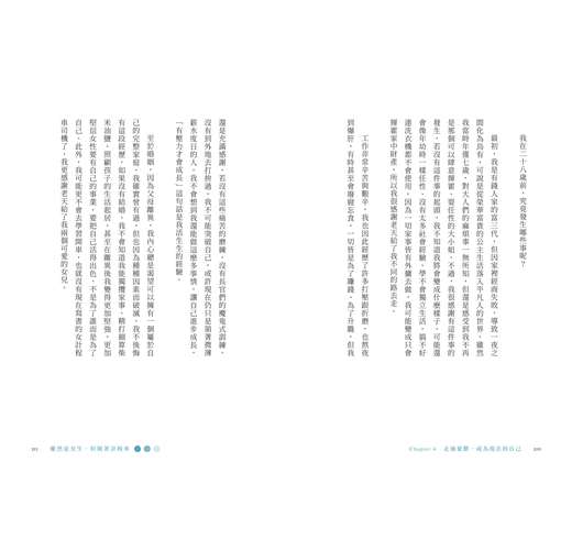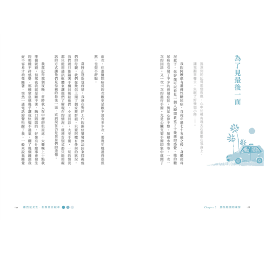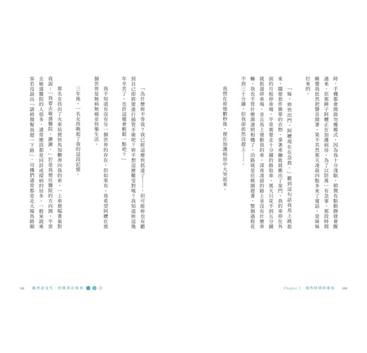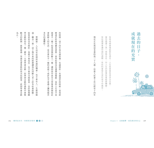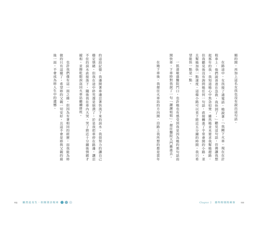 然而,當我仔細讀完本書所有內容才發現,王婧最有勇氣的並不是當計程車司機,而是在獨自面對重度憂鬱症時,還願意走向人群,創立粉專、出書,將這些不堪回首的過往寫出來,並試圖鼓勵大家要「好好生活」。