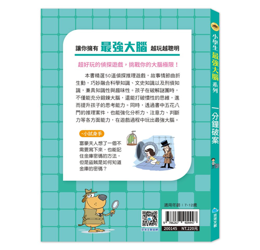 本書精選50道偵探推理遊戲,故事情節曲折生動,巧妙融合科學知識、文史知識以及刑偵知識,兼具知識性與趣味性。孩子在破解謎團時,不僅能充分鍛鍊大腦,還能打破慣性的思維,進而提升孩子的思考能力。同時,透過書中五花八門的推理案件,也能強化分析力、注意力、判斷力等各方面能力,在遊戲過程中玩出最強大腦。