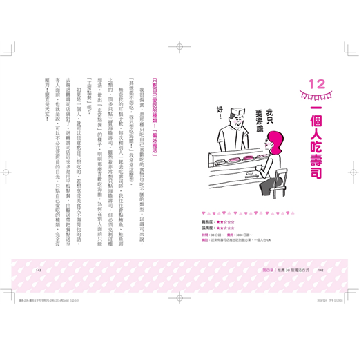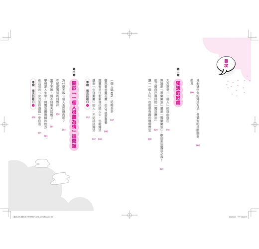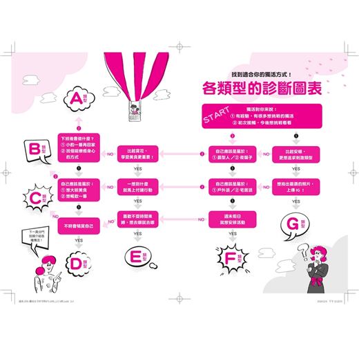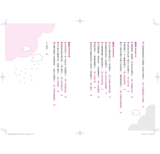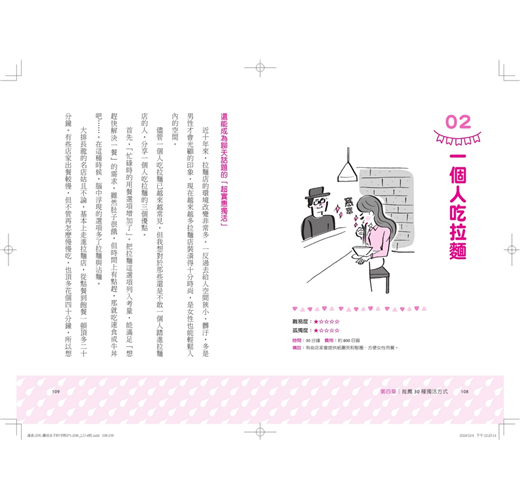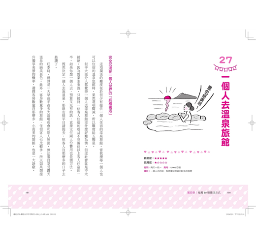 想探索「獨活究竟是怎麼回事」,沉浸在個人世界的人,請閱讀第一章到第三章。想現在就立刻一個人出門遊玩的人,請參閱第四章,裡面有依難易度區分的三十種獨活方式。想了解一些獨活的小撇步,請參考頁面下方的資訊,或許閱讀這本書,可以讓你的獨處時光變得更愉快、幸福和精彩。