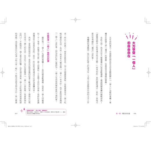 我的工作環境常常需要在人群中活動,但我其實非常珍惜、享受屬於自己的獨樂時光。這本書就像是一張通往獨活樂園的地圖,滿滿的實用建議以及真實故事,會讓你忍不住想試試。看完書之後發現,我還有好多獨活生活還沒體驗,想邀請你們一起來加入,看大家的「獨活」之旅走到哪了呢?!