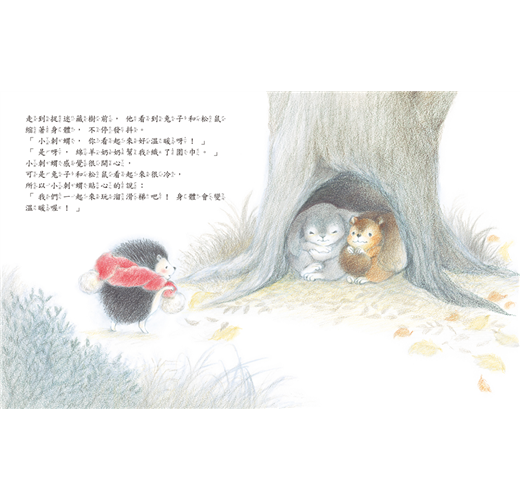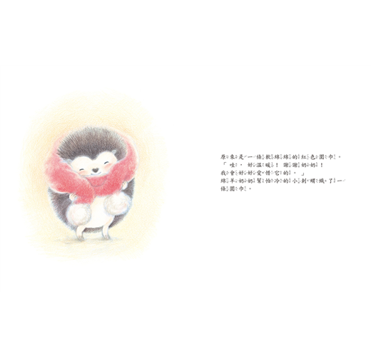 紅色圍巾作為綿羊奶奶的愛心象徵,讓故事增添濃厚的親情元素,結合小刺蝟與朋友間的互動,適合作為家長和孩子共讀時的情感教育素材。
